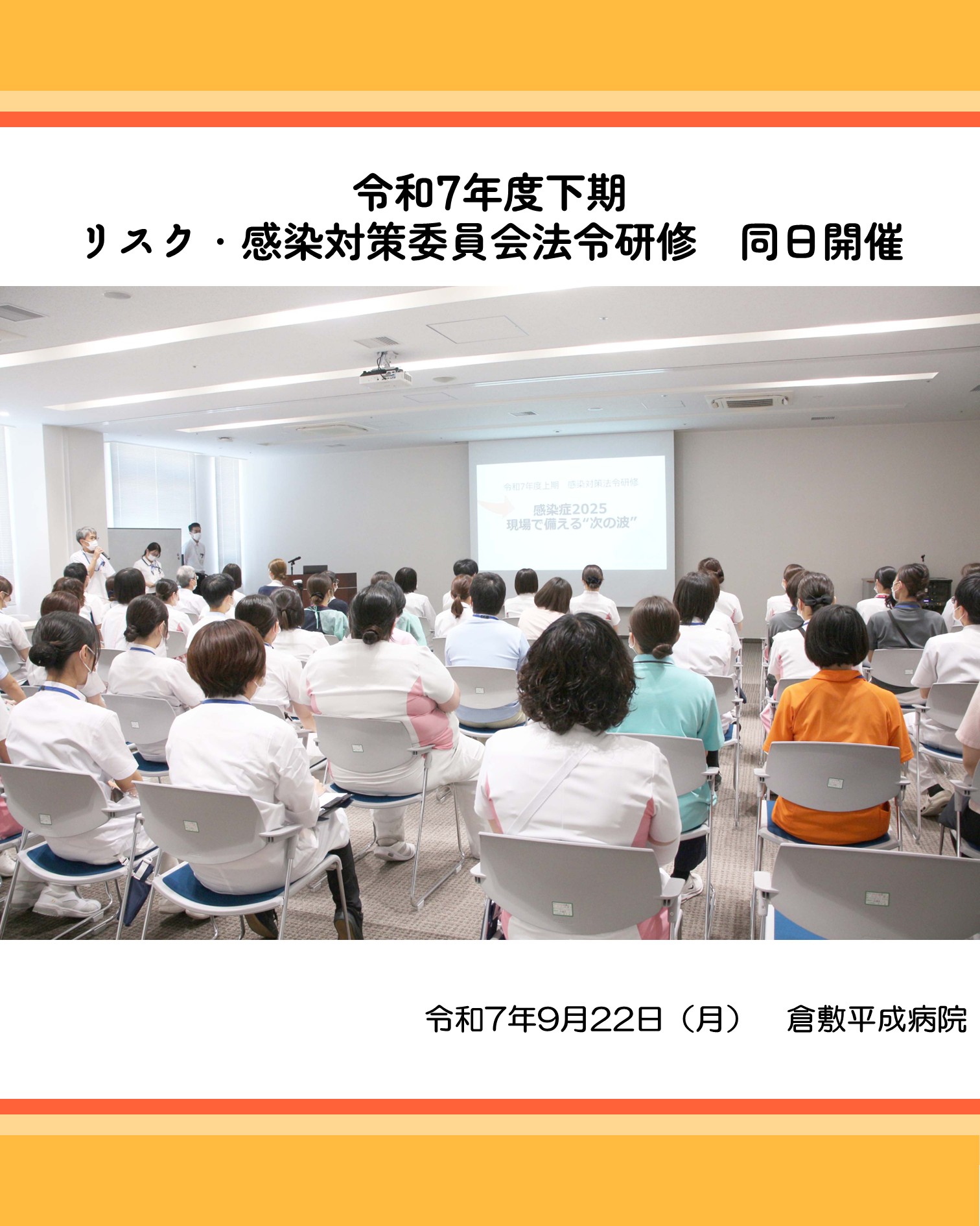 令和7年9月22日(月)に救急棟4階会議室にて「令和7年度上期リスク・感染対策委員会法令研修」が同日開催されました。感染対策の観点から、人数を制限しての開催となり69名の職員が参加しました。