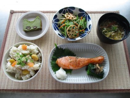 きのこの炊き込みご飯、鮭の昆布〆、金平ゴボウと水菜のサラダ、オクラとエノキのとろみスープ、黒豆入り抹茶チーズケーキで、560kcal、塩分3.0gです。