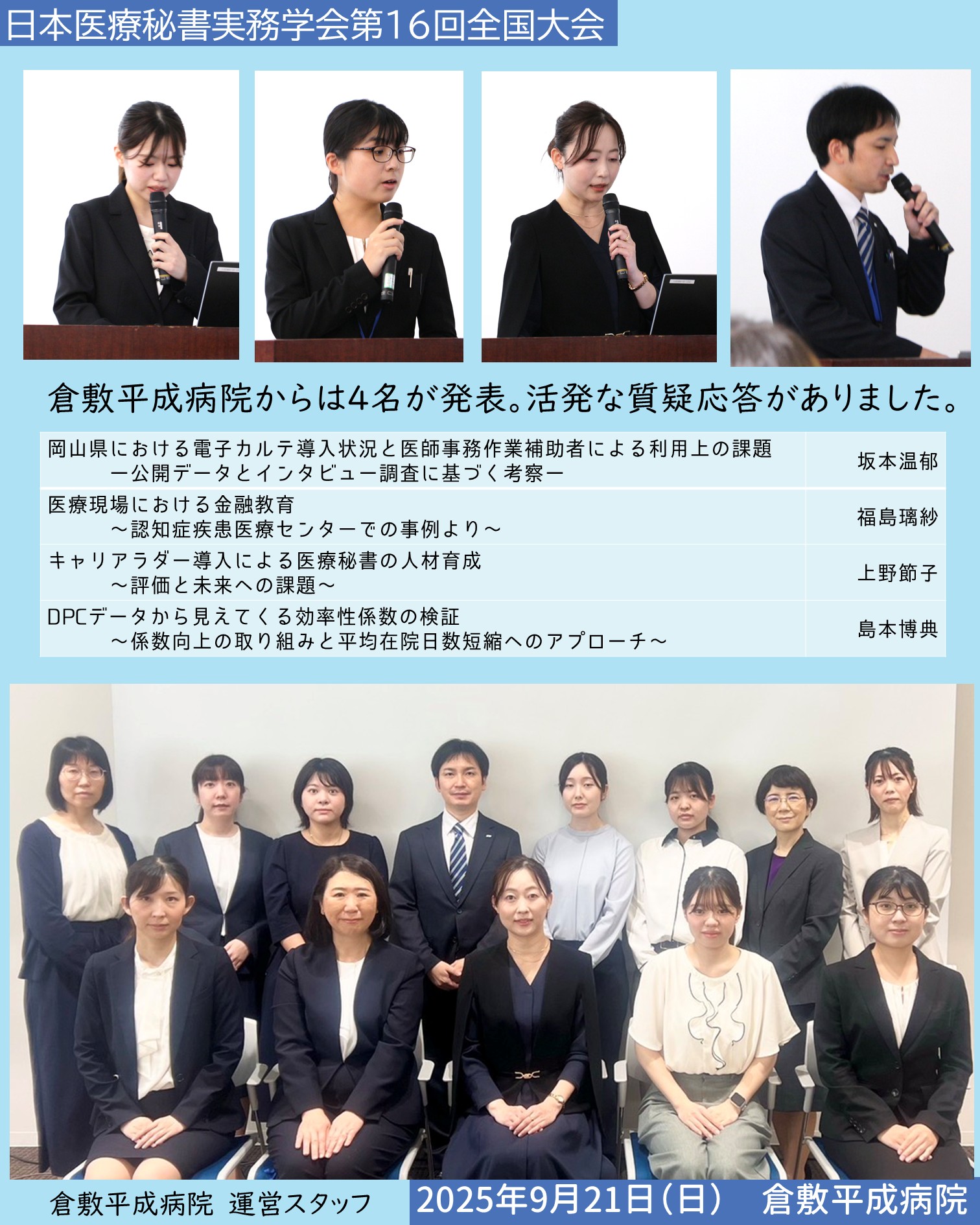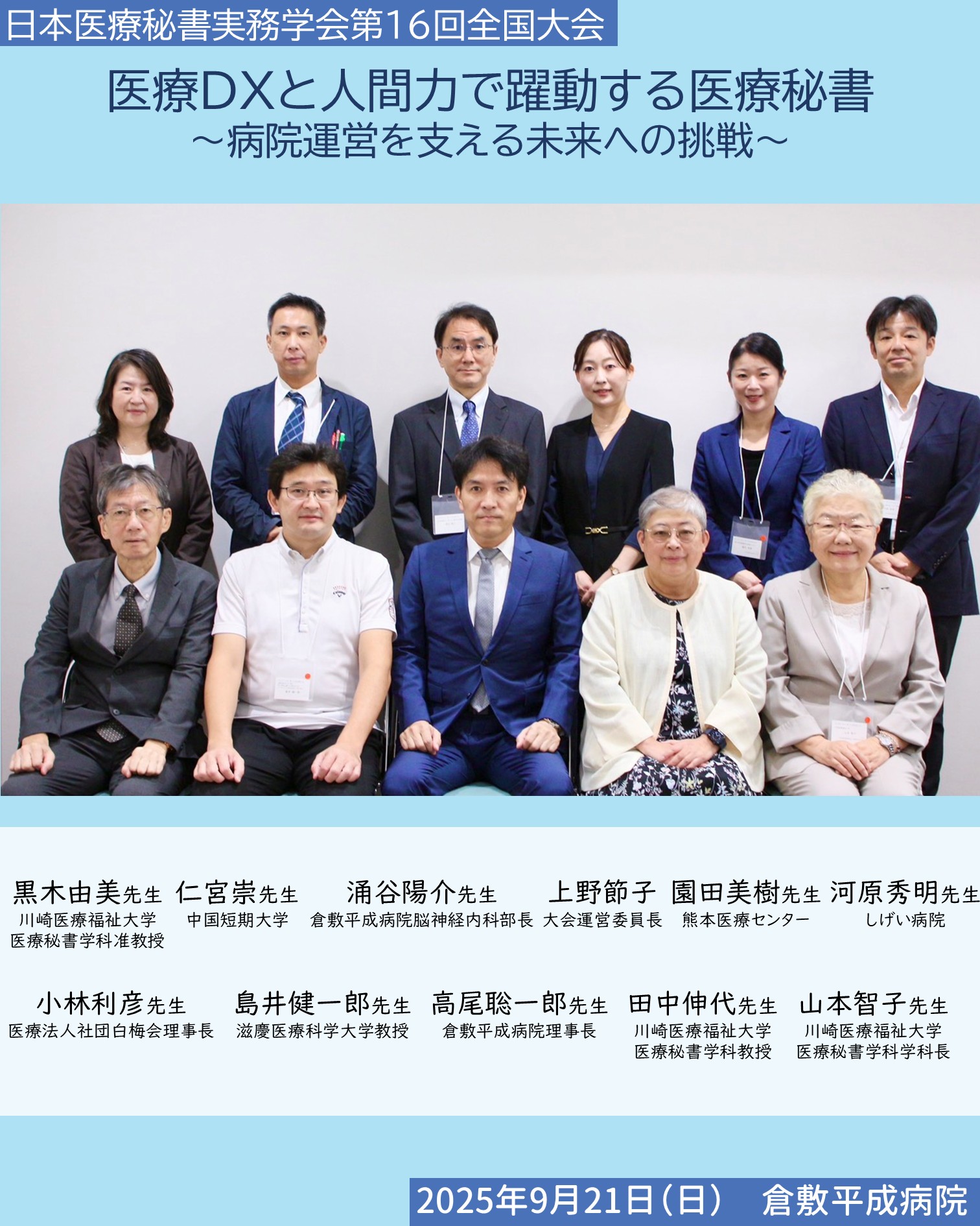 日本医療秘書実務学会第16回全国大会を、2025年9月21日(日)、倉敷平成病院で、「医療DXと人間力で躍動する医療秘書~病院運営を支える未来への挑戦~」をテーマに開催しました。
