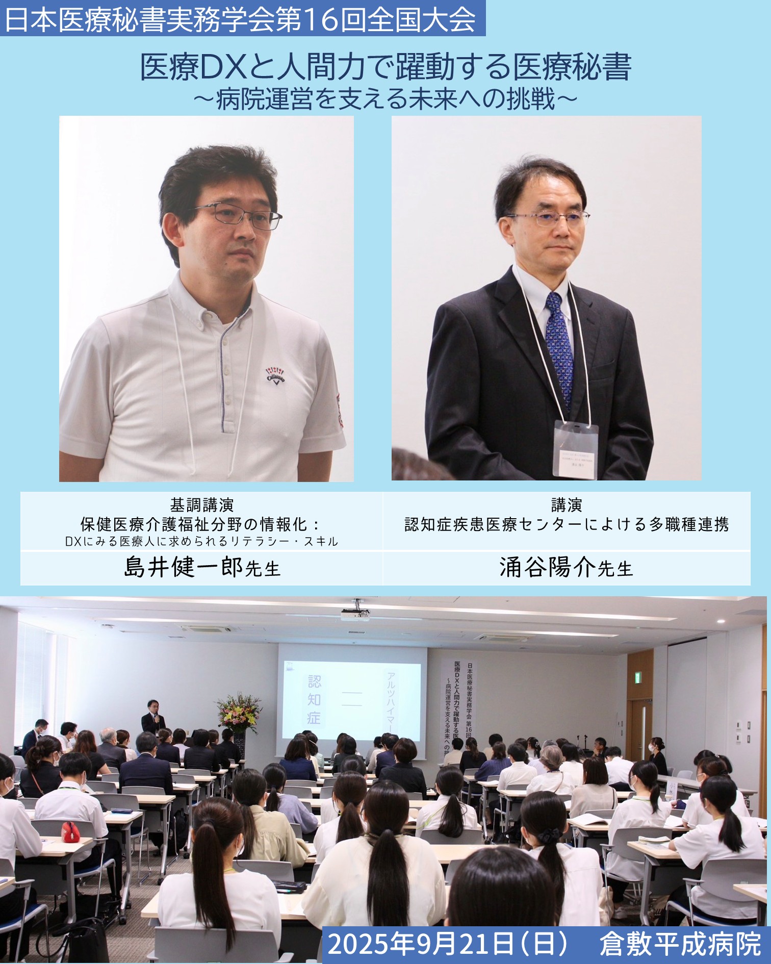また、涌谷陽介先生(倉敷平成病院 脳神経内科/認知症疾患医療センター長)には、「認知症疾患医療センターにおける多職種連携」をテーマに、実務現場での医療秘書をとりまく多職種連携についてご講演頂き、当院での医療秘書の活躍やチーム医療連携の強さを参加者から高く評価頂きました。