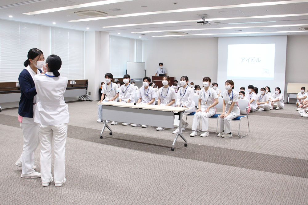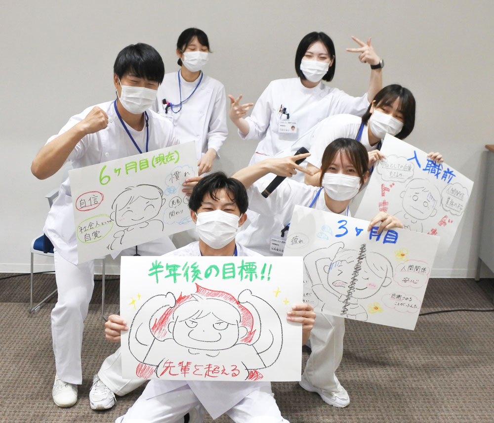 グループ対抗戦のゲームにてリラックスしてもらいながら職種を超えた横のつながりを深めてもらったり、グループワークにて「入職前」「3ヵ月目」「6ヵ月目」の振り返りと「半年後の課題・目標」を同期内で共有し、紙芝居形式で発表することで、自身の現在の立ち位置を確認してもらいました。