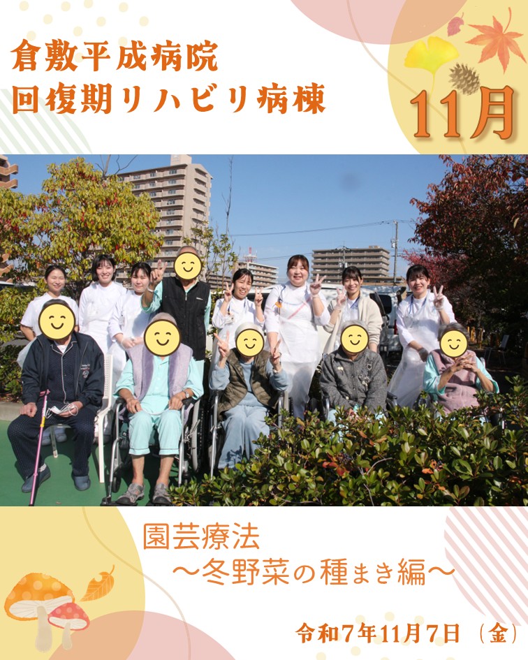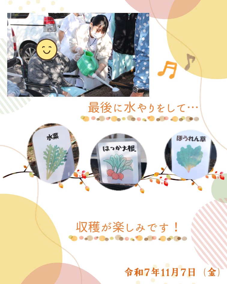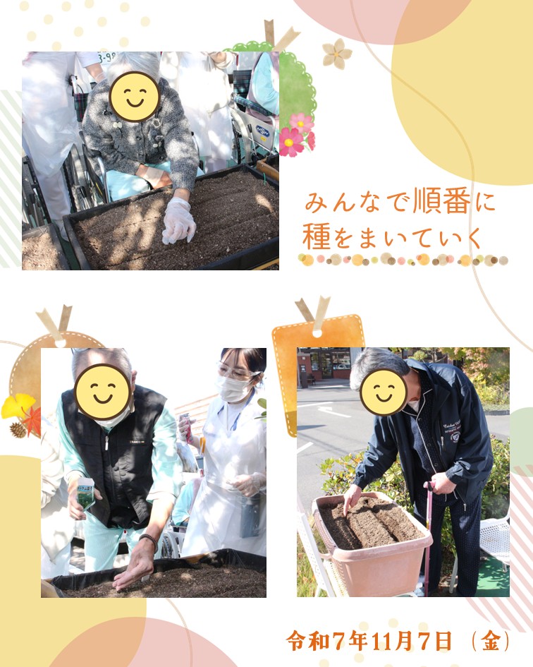 「水やりをしないといけないね」とプランター活動を楽しみにしてくださっている患者さんもおられました。「気分転換になった」「葉っぱが赤くなってるね」と季節を感じながら種まきを楽しまれる患者さんの姿がみられて嬉しかったです。
