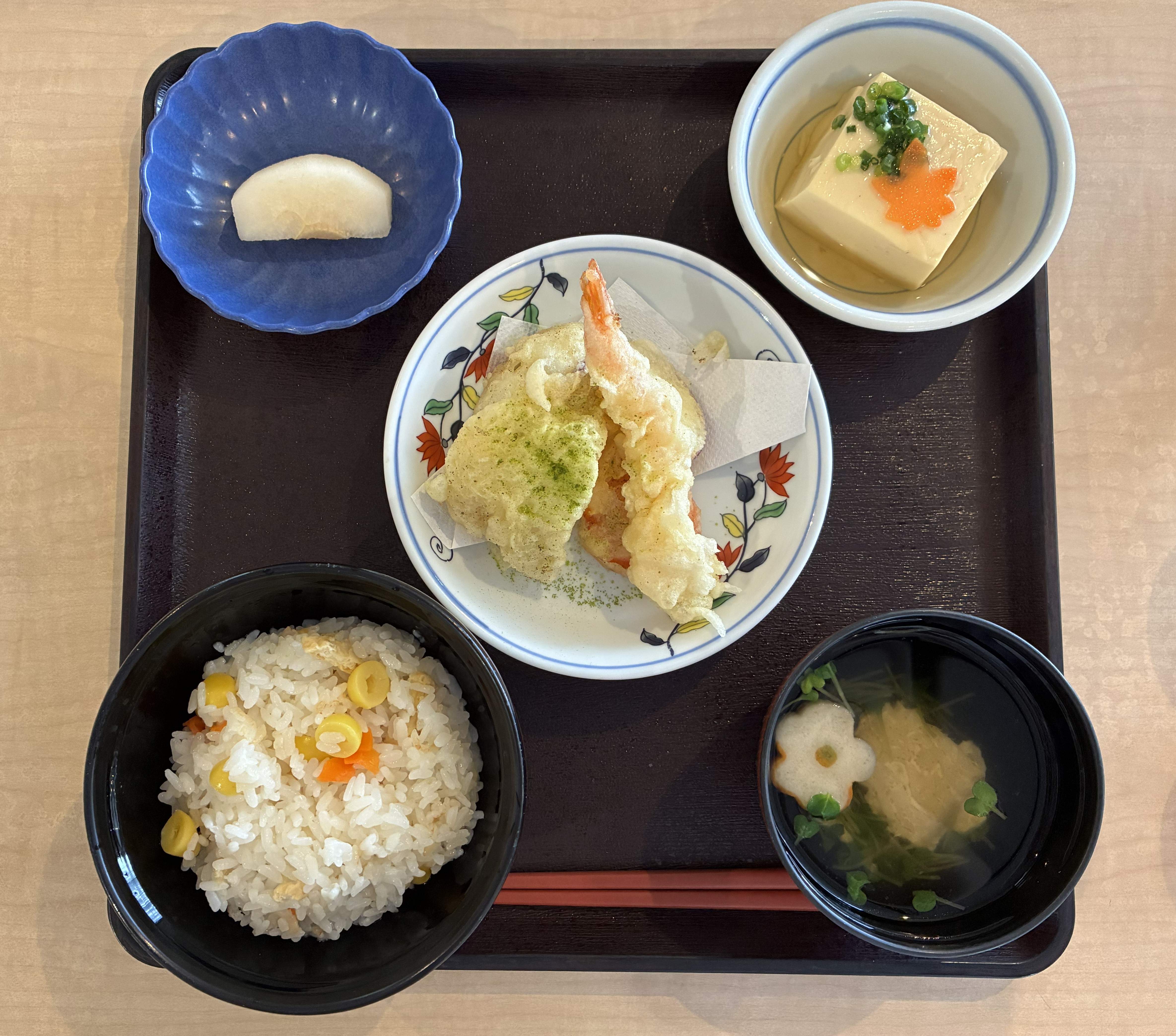 もちろんお食事自体も、お誕生会食として気合いを入れたお食事を提供させていただきました。銀杏のおこわ、天婦羅盛り合わせ、鱧のお吸い物、卵豆腐盛り、季節の果物。旬の食材や人気の献立を取り入れた特別献立です。職員も一緒にホールで食べましたが、おいしかったです。