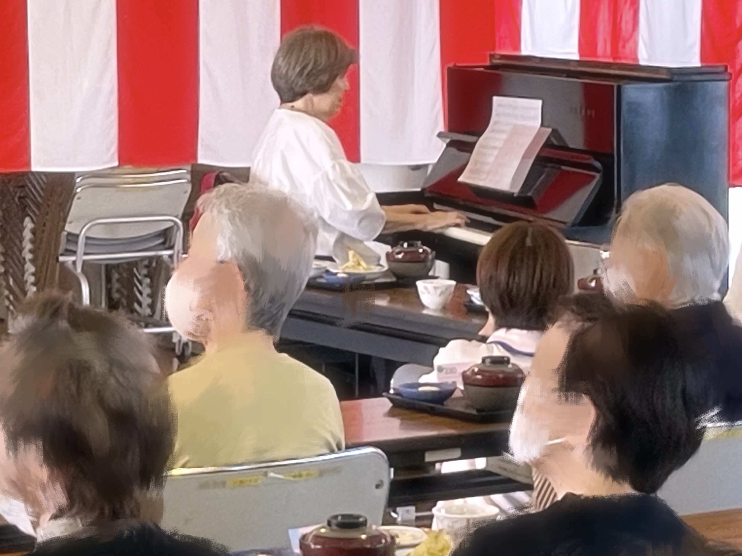 第一部としてお食事の前には、みんなでケアハウスの式歌や、お誕生の歌を歌いました。伴奏はなんと副理事長によるピアノの生演奏です!生演奏による斉唱は、一体感と臨場感があって良いですね。お食事のあとには第二部としてボランティアさんによる「民謡を楽しむ会」もあり、終始和やかな雰囲気で素敵な会となりました。