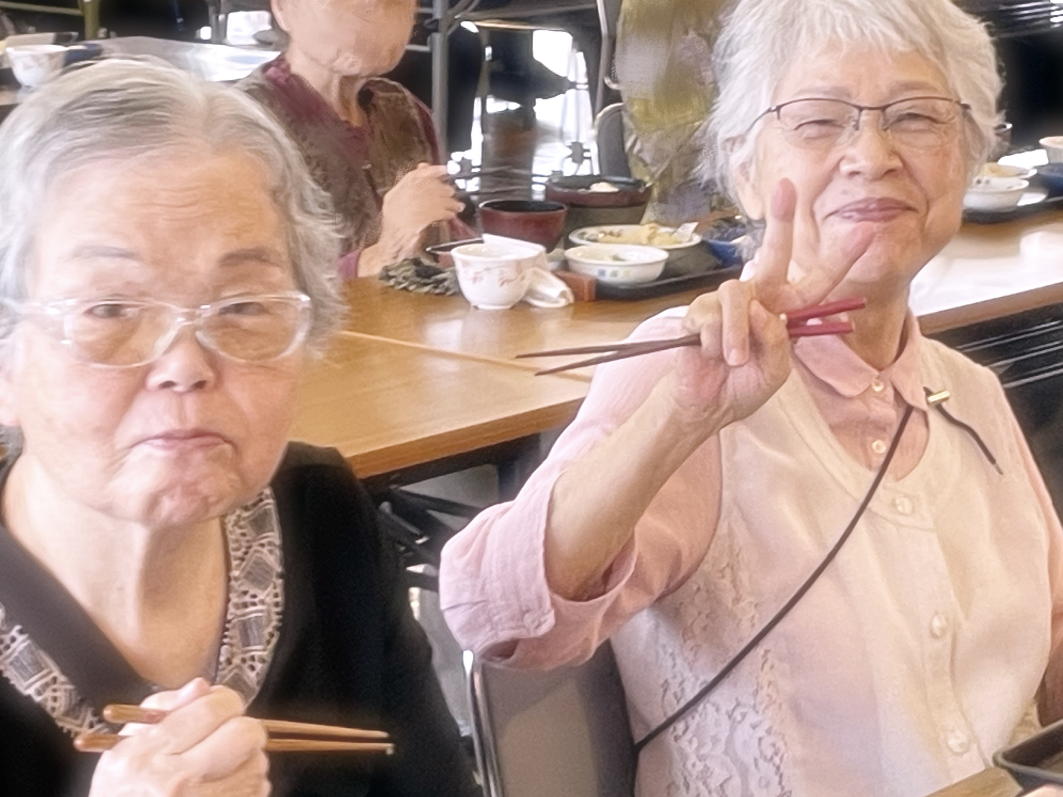 ケアハウスには2階から5階まで各階に食堂があり、普段はそこでお食事を食べるのですが、お誕生会では1階のホールに集まって、みんなでお食事をいただきました。いつもは席が離れていたり、階が違ったりする仲良しの方と一緒に食べるお食事は楽しそうで「今日の御飯はおいしい」と笑みがこぼれます。