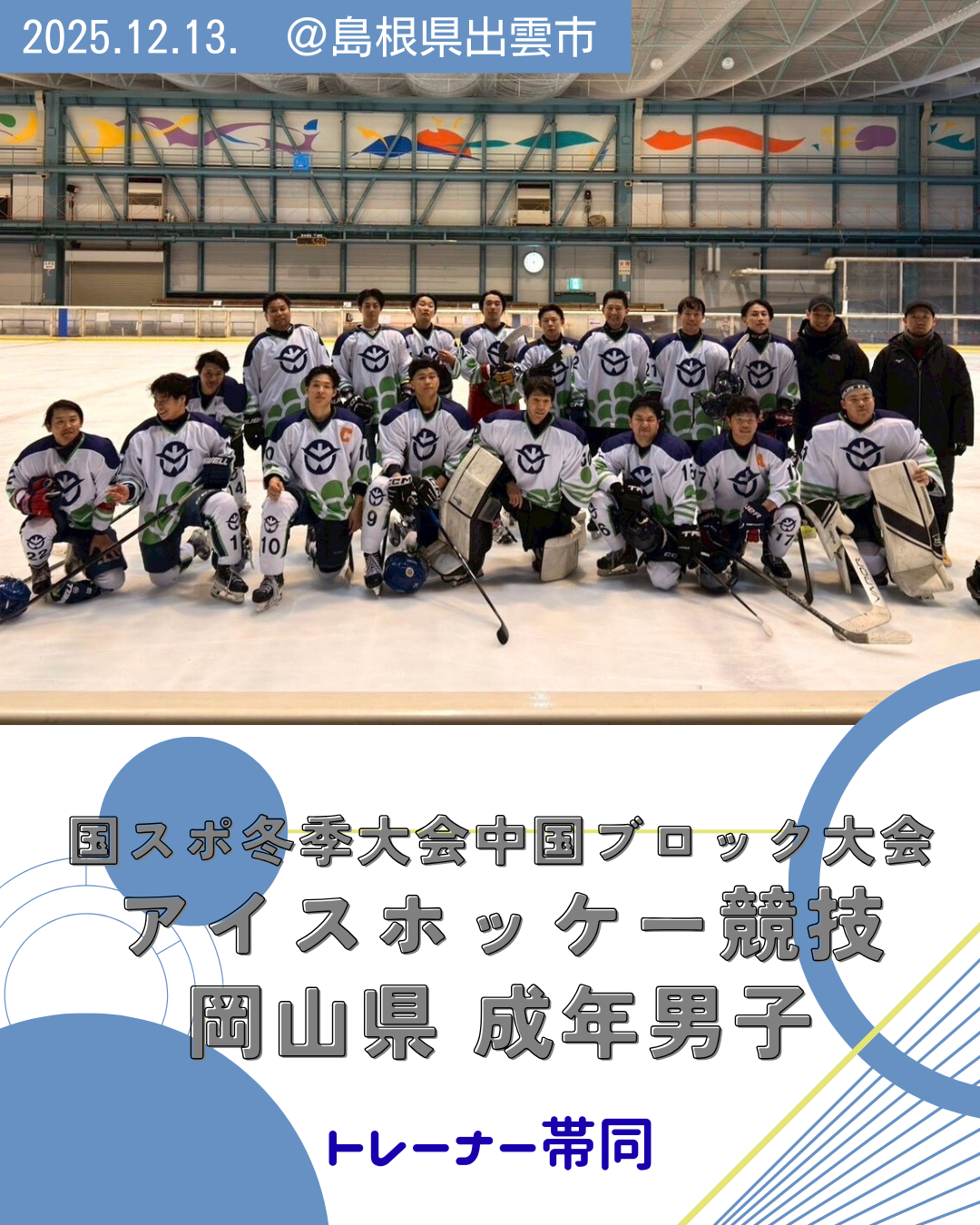 2025年12月13日に島根県出雲市宍道湖公園湖遊館で開催された第80回国民スポーツ冬季大会中国ブロック大会アイスホッケー競技の成年男子岡山県代表に当センターの川元(PT、JSPO-AT)が帯同しました。