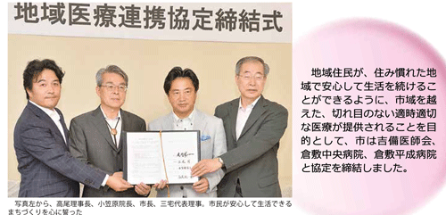 市は吉備医師会、倉敷中央病院、倉敷平成病院と「地域医療連携に関する協定」を締結しました。