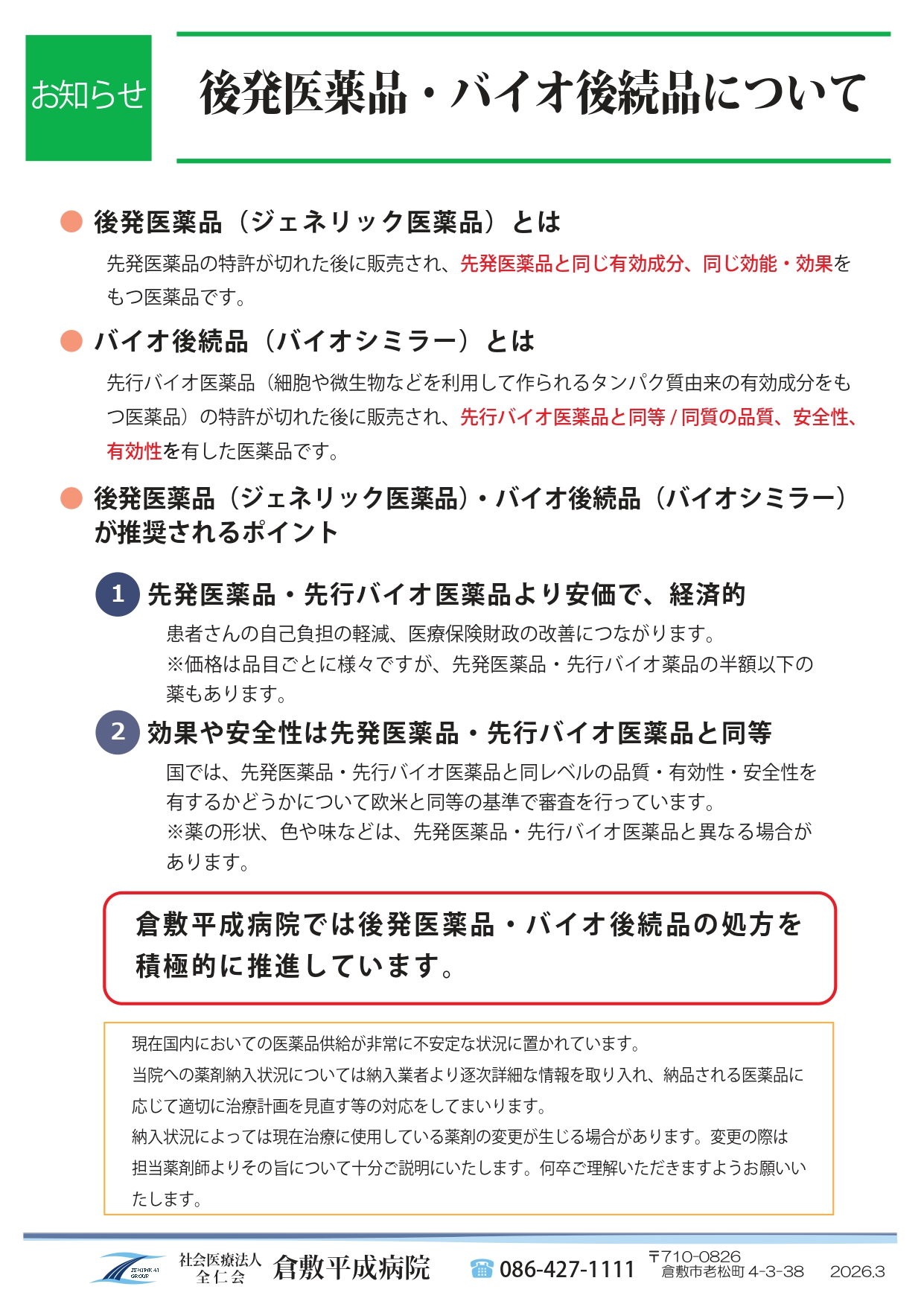後発医薬品・バイオ後続品についてご案内 カテゴリー: 薬剤部 | 投稿日: 2024年6月1日(土曜日) | 投稿者: heiseiblog 倉敷平成病院では、後発医薬品・バイオ後続品の処方を積極的に推進しています。 ご理解、ご協力の程よろしくお願い申し上げます。 案内PDF 薬剤部