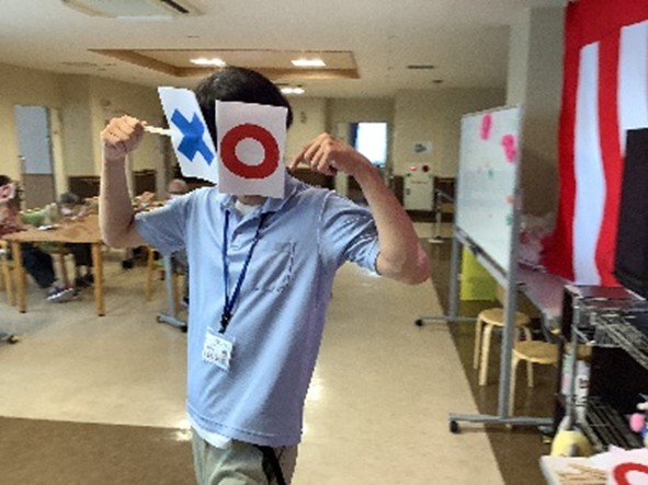 長寿のご利用者紹介が終わったあと参加者全員に○×の札を持っていただき○×ゲームを行いました。計10問出題し、その内の3問をここでご紹介します。
