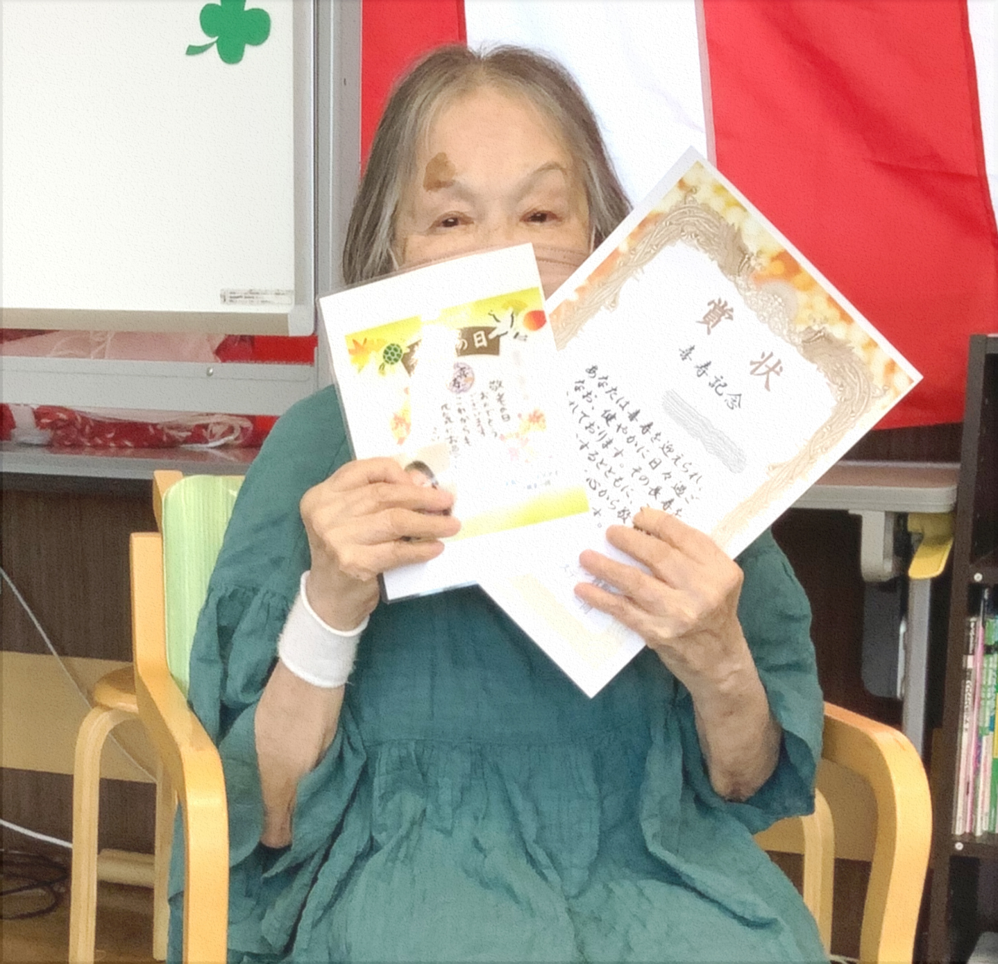 9月16日にピースガーデン倉敷ショートステイでは敬老祝賀会を開催しました。例年なら、秋の気配を少しずつ感じ、残暑があるなか開催していましたが今年はなにぶん暑い。9月中旬で35度を超える猛暑日での開催となりました。「梅雨明け宣言」みたいに「夏明け宣言」があればと思うくらいの今年の暑さです。