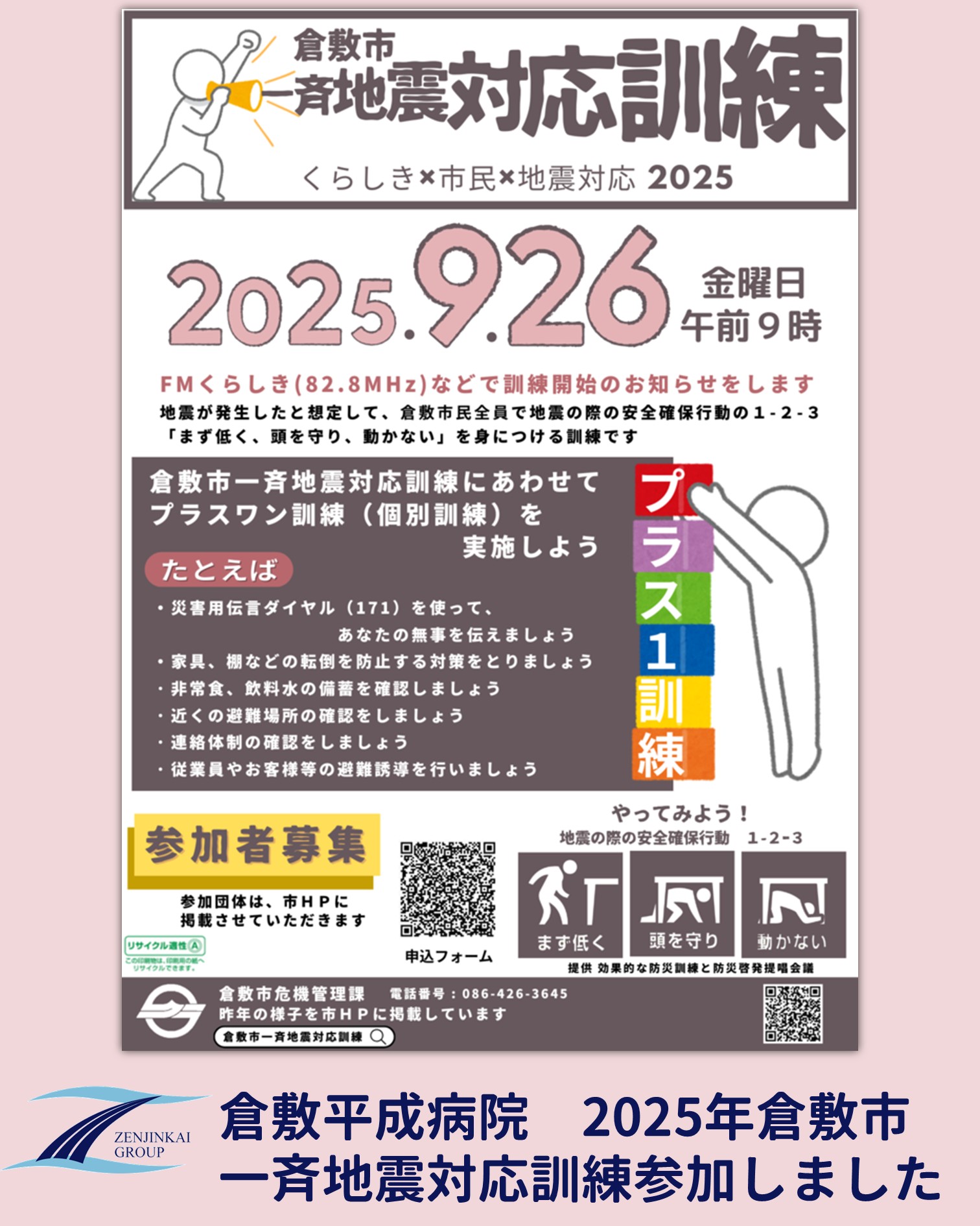 少し前のご報告となりますが、2025年9月26日(木)9時から実施された「倉敷市一斉地震対応訓練2025」に、倉敷平成病院も参加しました。
