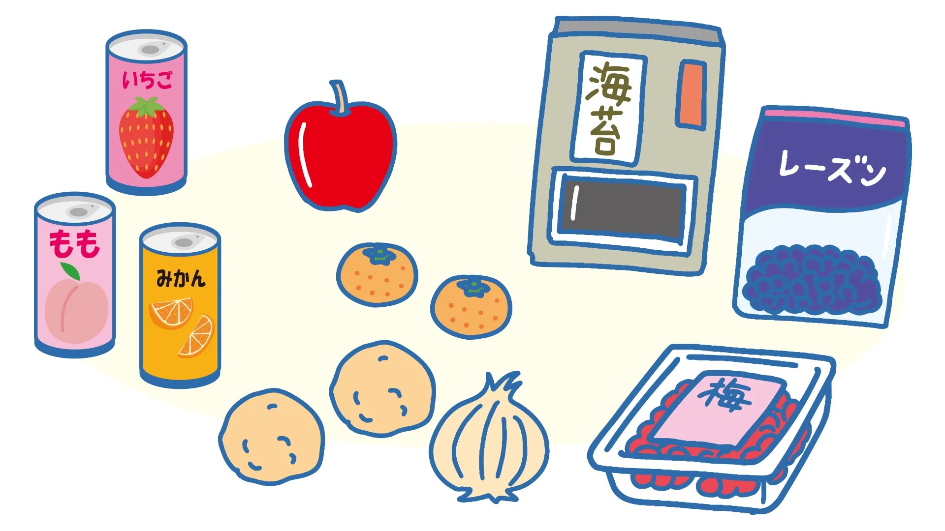 ③ 副菜:たまねぎやかぼちゃなど日持ちしやすいものや、糖分の少ない野菜ジュースなど。