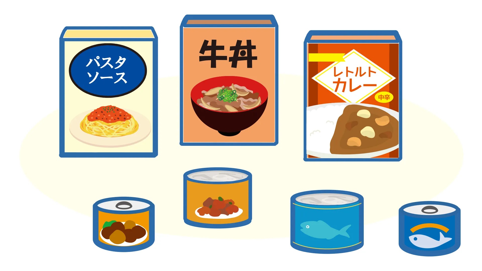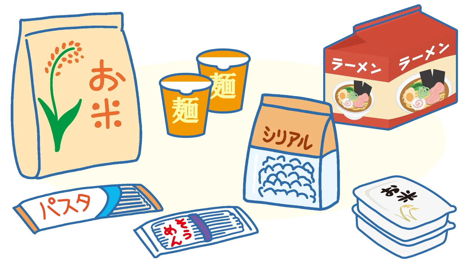 ① 主食:米、麺、パンなど。レトルトの粥や雑炊でも良いです。