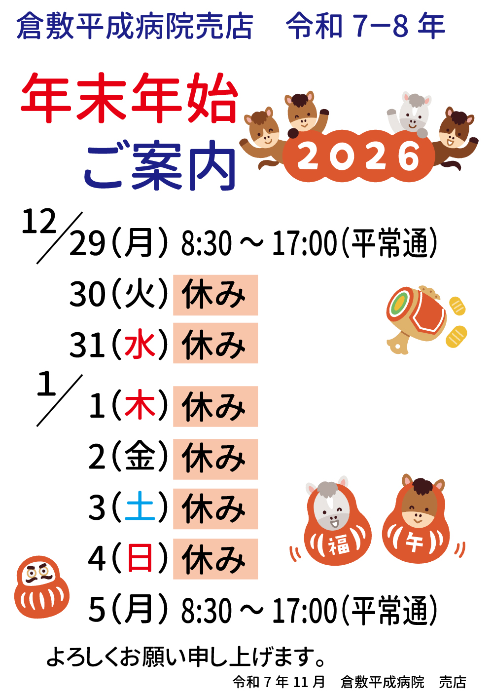 倉敷平成病院【売店】令和7年度年末年始営業のご案内