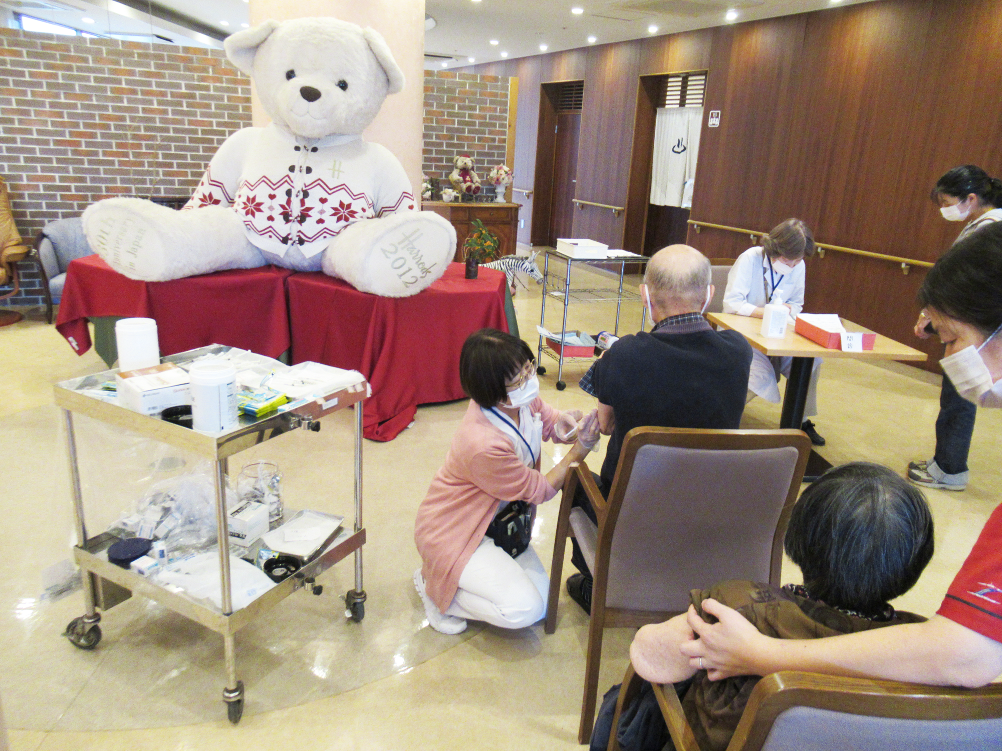 さて、急激な変化に伴い、インフルエンザの感染が広がってきています。今年は早くに広がっているのではないでしょうか。暑い夏を乗り越えたものの、体には少し疲れが残っていて抵抗力も落ちているのかもしれません。インフルエンザの対策としてワクチンの予防接種が有効です。サ高住グランドガーデン南町、特定施設グランドガーデンでも11月6日に予防接種を行いました。冬に向けた大切な体の準備です。