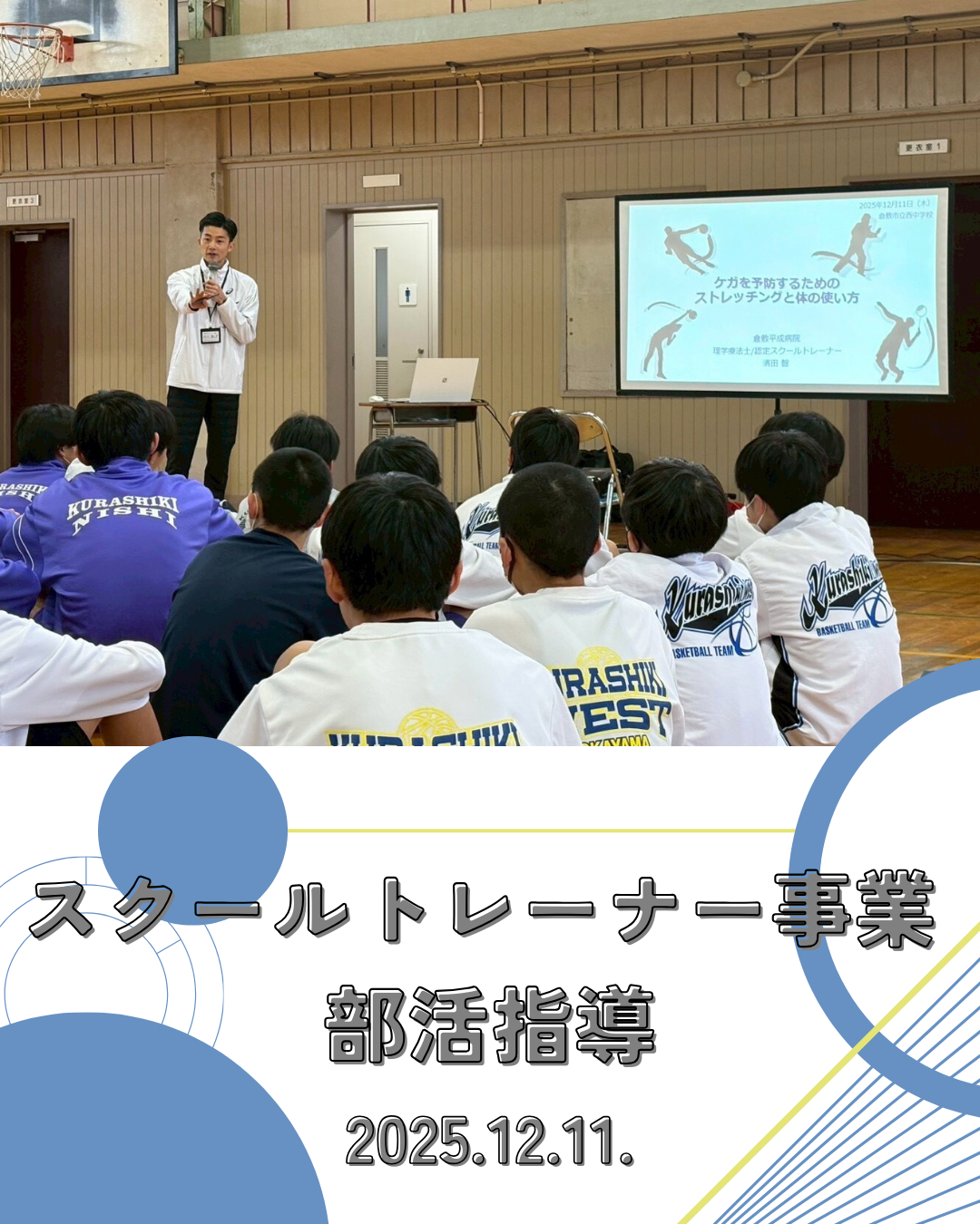 2025年12月11日にスクールトレーナー(略してScT)事業の一環として倉敷市立西中学校の部活動指導を当センターの濱田(PT,ScT)と県内スクールトレーナー5名で行いました。