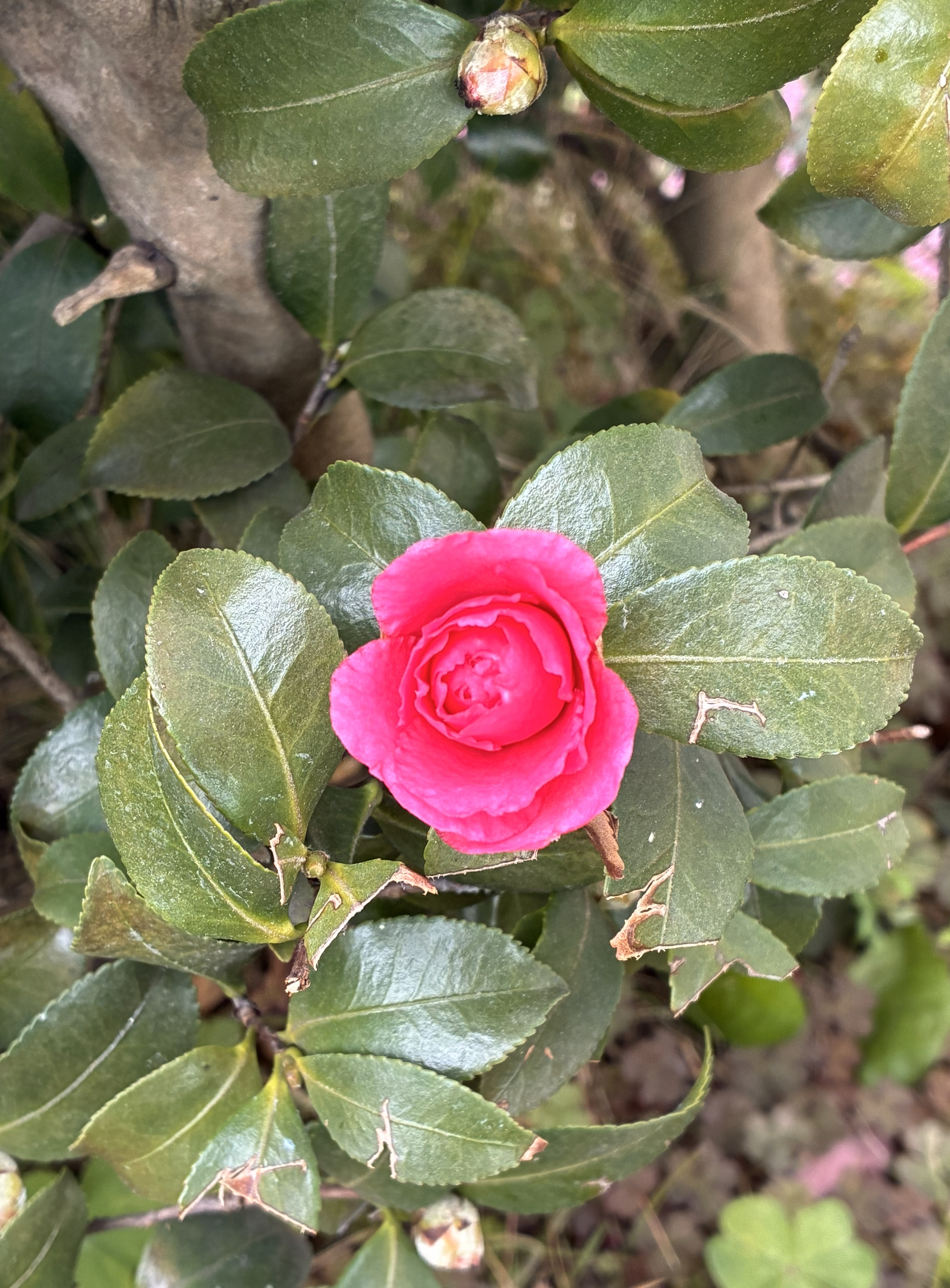 その気持ちを察してくれたかのように、数日後、寒い中サザンカが一輪花を咲かせてくれました。鮮やかな色の花に心弾み、気持ちがふっとあたたかくなって、自然と笑顔に。