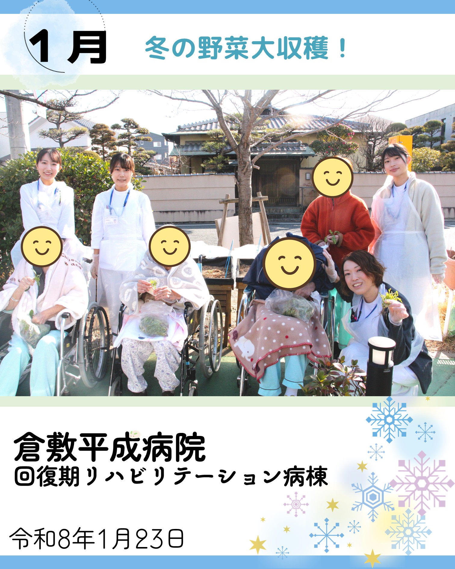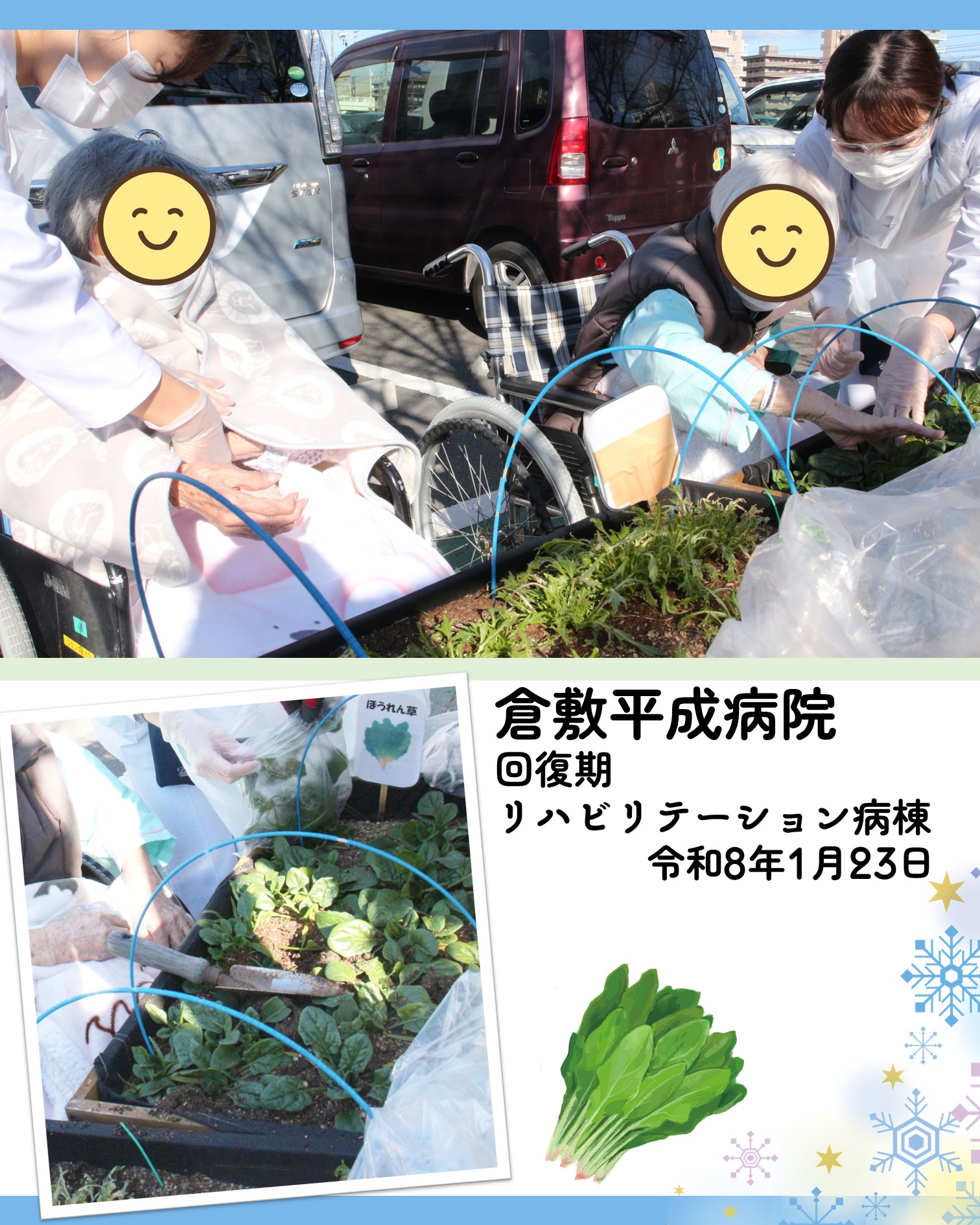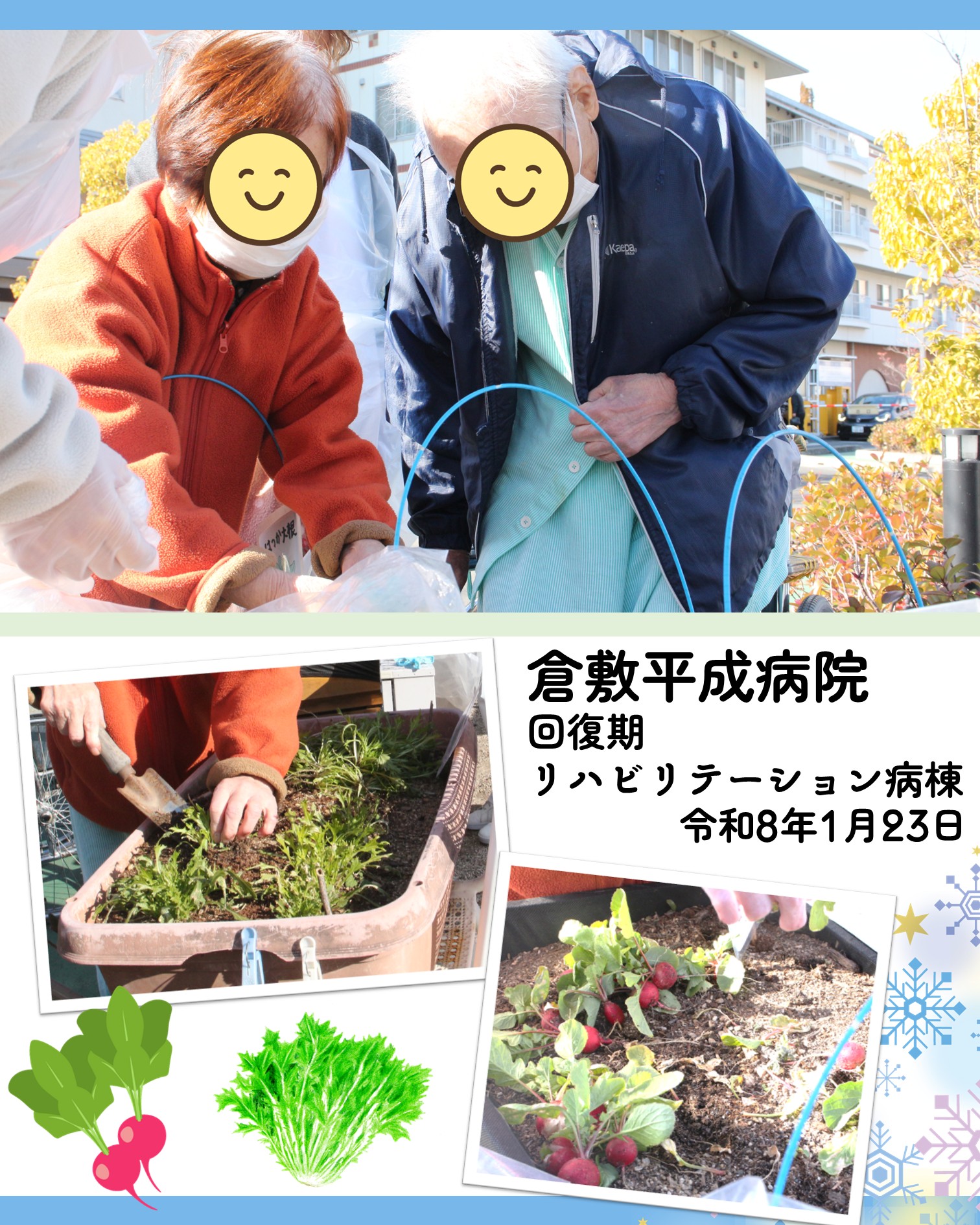 1月23日(金)、回復期リハビリテーション病棟の患者さん方が昨秋から種まきを始め、大切にお世話をしてくださった、ミズナ、ホウレンソウ、ハツカダイコンが立派に実りました!寒い中ではありますが、みなさんお元気に収穫をしてくださいました。