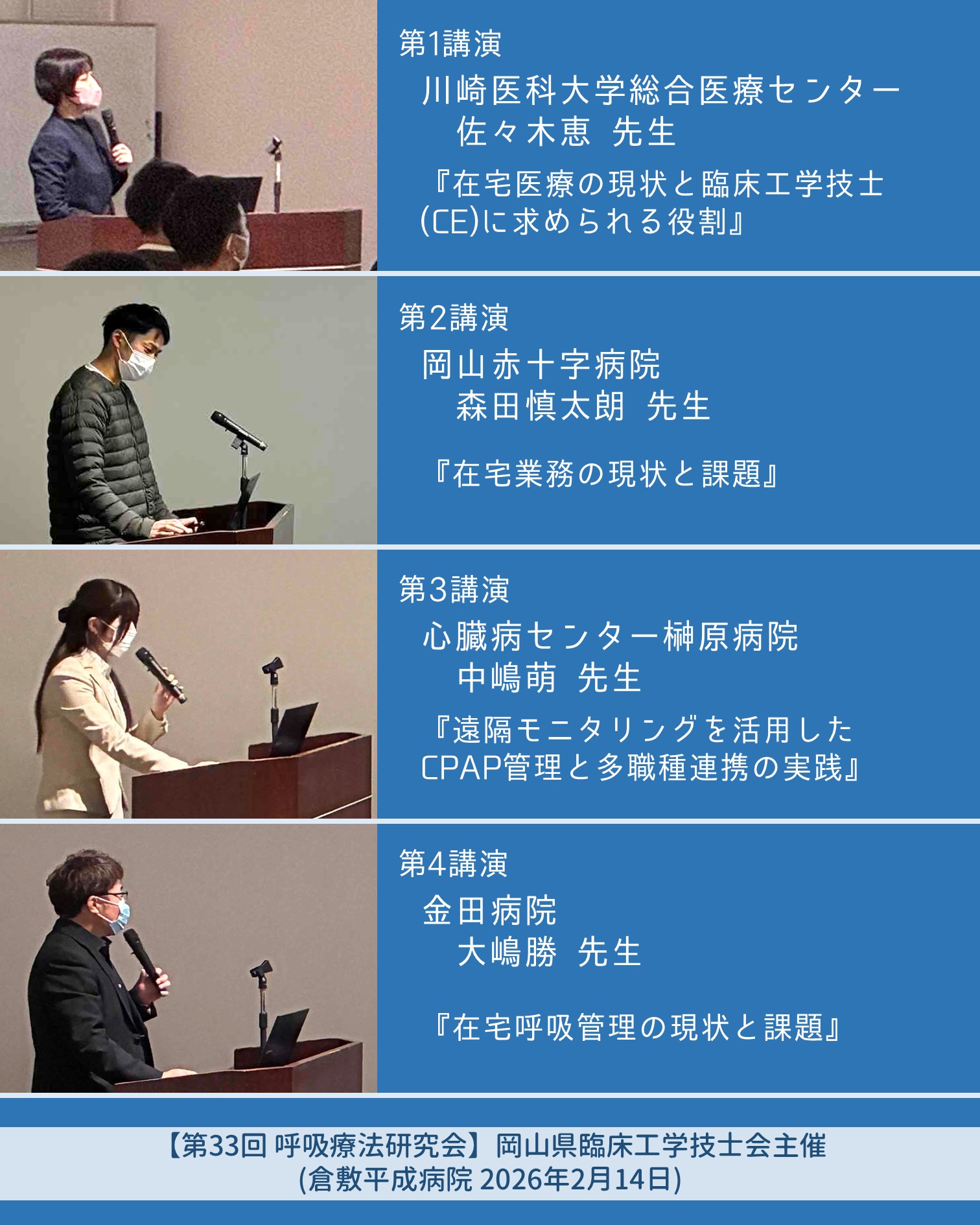 『岡山県臨床工学技士会 呼吸療法委員会』では、今後も引き続き、セミナーや研究会の開催を通じて、皆様に有益な学習の機会を提供できるよう努めてまいります。今後とも、本委員会の活動に対し、変わらぬご理解とご支援を賜りますよう、よろしくお願い申し上げます。