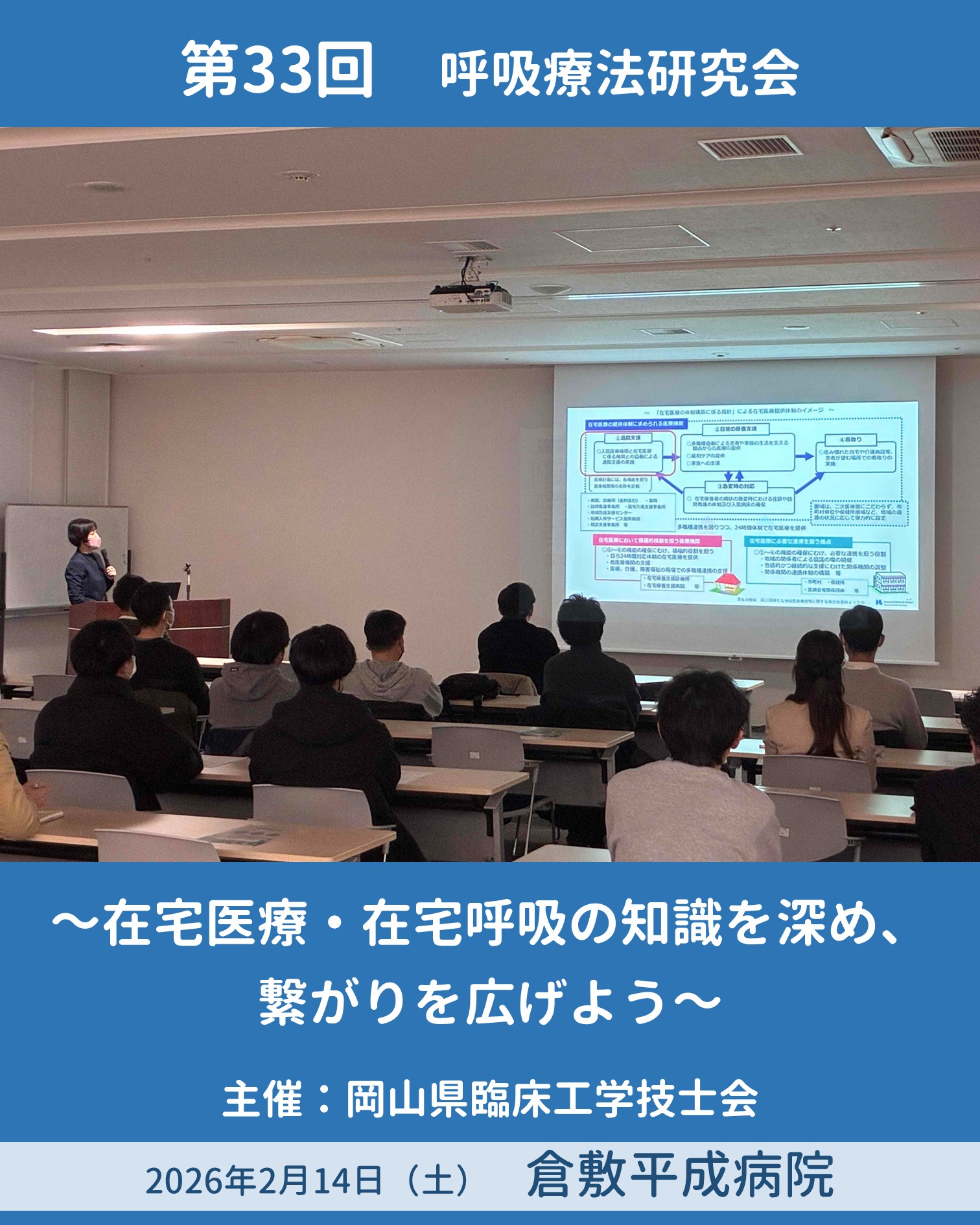 2月14日、倉敷平成病院において、「第33回呼吸療法研究会」が開催されました。当日は県内各施設より講師をお迎えし、「在宅医療・在宅呼吸の知識を深め、繋がりを広げよう!」をテーマに各講演が行われ、参加者とスタッフ含め31名の方が参加下さいました。