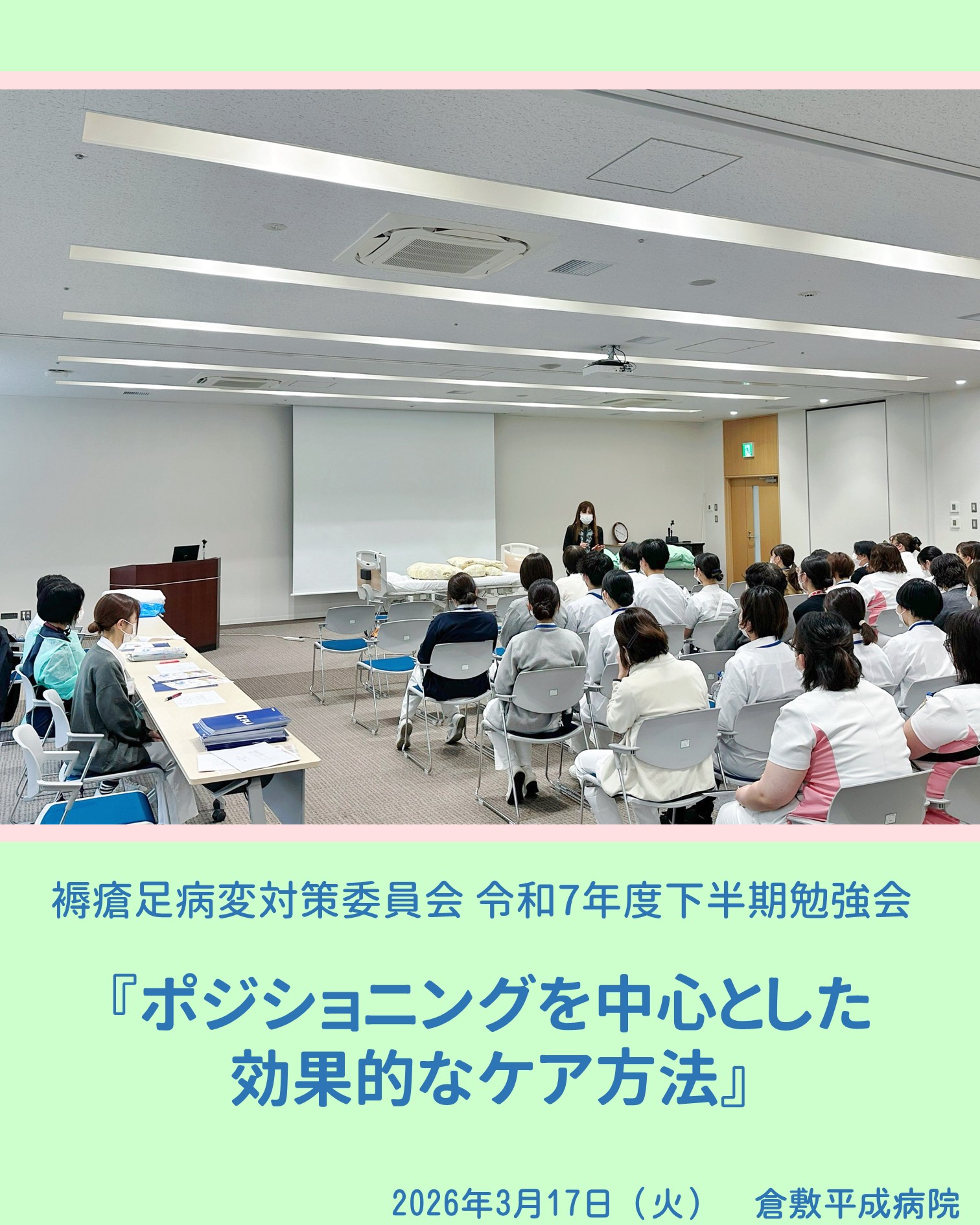 3月17日(火)、褥瘡・足病変対策委員会主催による令和7年度下半期褥瘡勉強会を、「ポジショニングを中心とした効果的なケア方法」をテーマに開催しました。