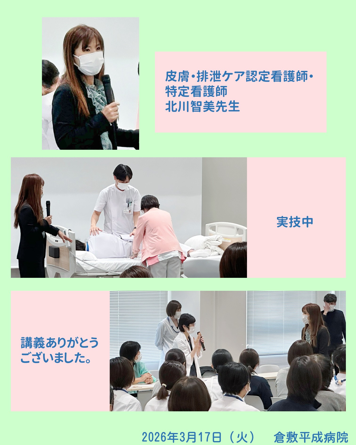 今回は、皮膚・排泄ケア認定看護師・特定看護師である北川智美先生をお招きし、短時間ではありましたが、実技を交えながら要点を押さえたご講義をいただきました。