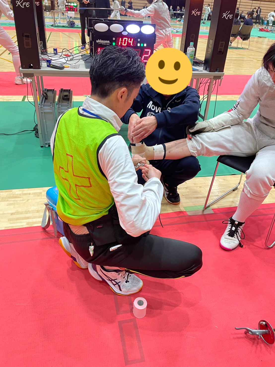 試合中の外傷に対しては、5分間のインジュリータイムの間に判断とテーピングなどの処置が必要で迅速な対応が求められます。