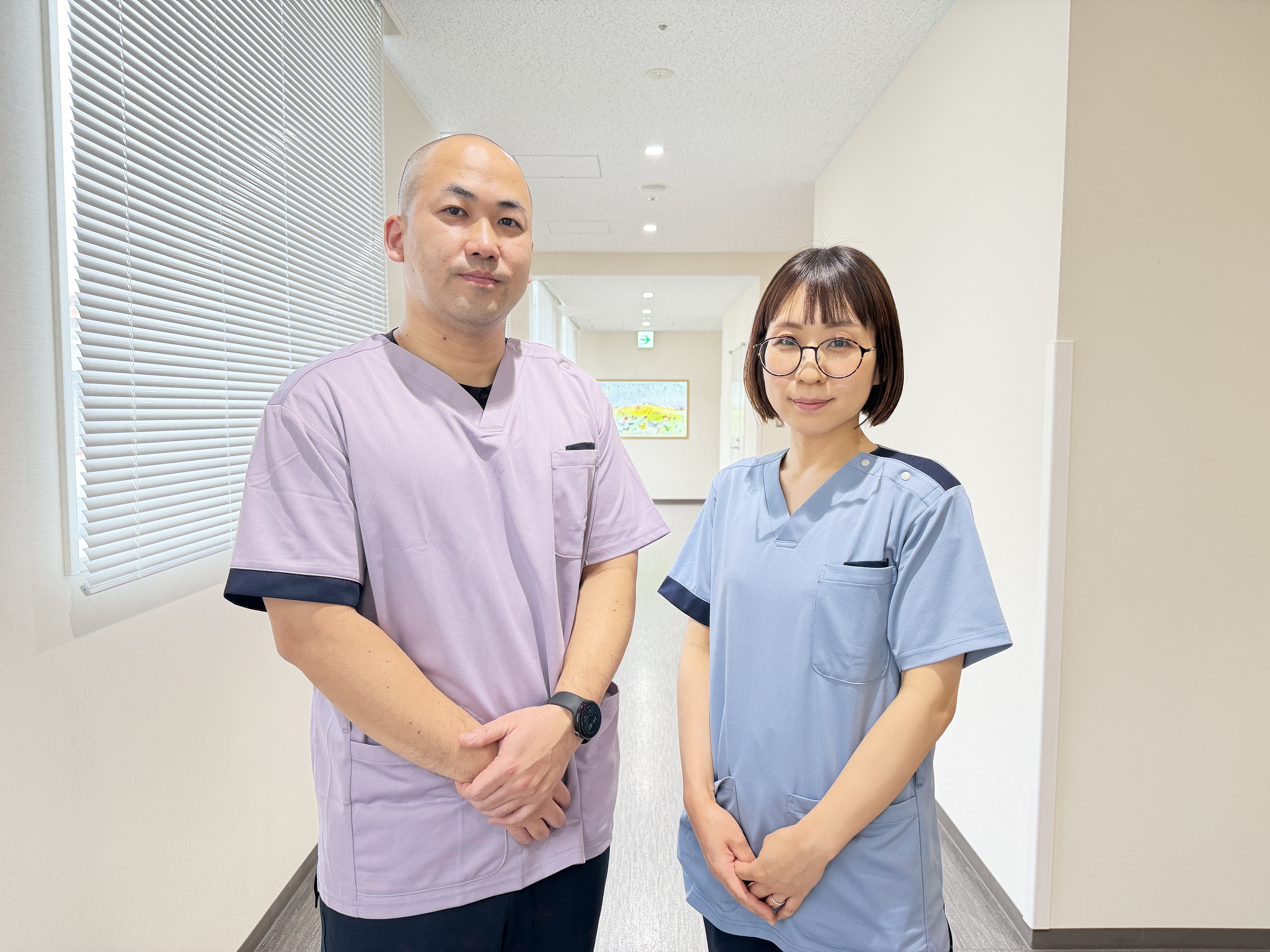 これまでの白と水色を基調としたデザインから一新し、ズボンは落ち着いた紺色に、上衣は青色と紫色の2種類から選べる仕様となっています。分かりやすい配色で、一目で介護スタッフと分かるデザインです。