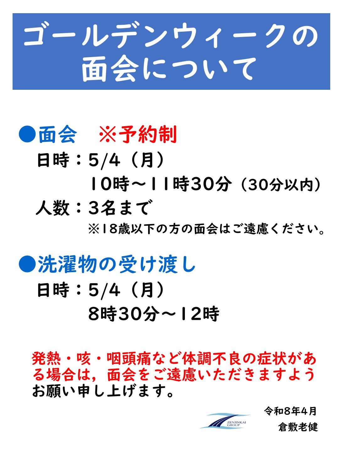 ゴールデンウィーク期間(5/3~5/6)の面会についてご案内をさせていただきます。