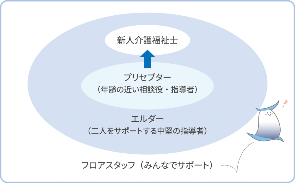 新人職員には「プリセプター」といわれる年の近い職員がマンツーマンで実務を通じて教育を実施します。プリセプターは、慣れない環境で負担や不安を抱えている新人職員を精神的にもフォローします。また、「エルダー」というプリセプターの補佐役となる先輩がついて、二人をサポートしています。主にこの「プリセプター」と「エルダー」が教育の中心となりますが、二人だけに任せるのではなくフロアの職員皆で新人職員の教育体制をバックアップしています。