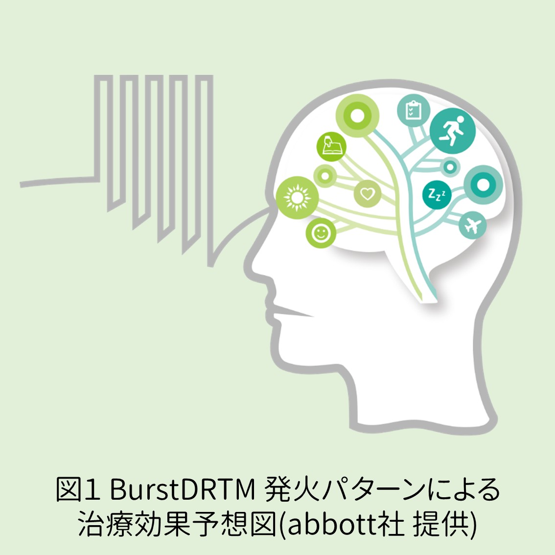 BurstDR™刺激は、ダーク・デ・リダー(Dirk De Ridder)博士が約10年にわたり研究を重ねて開発した刺激方式で、体内の自然な神経発火パターンを模倣した「バースト(断続的)」パルスを用いる点が特徴です(図1)。