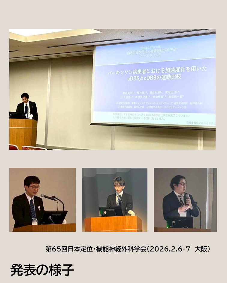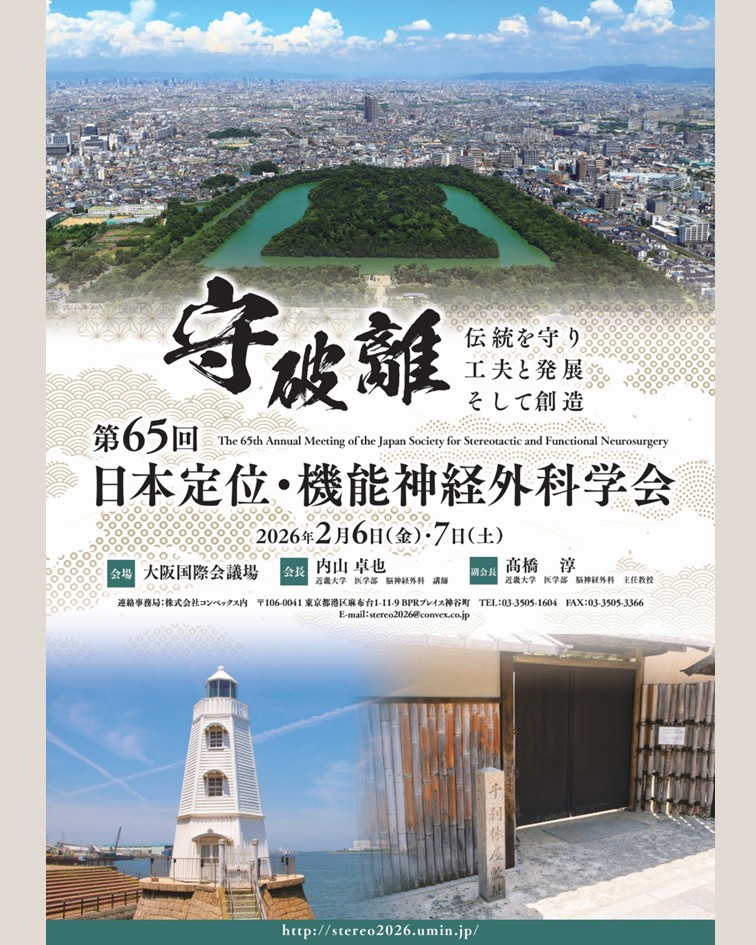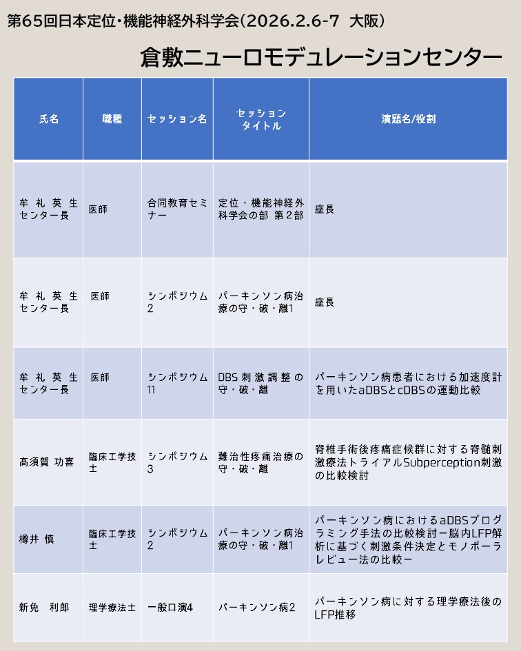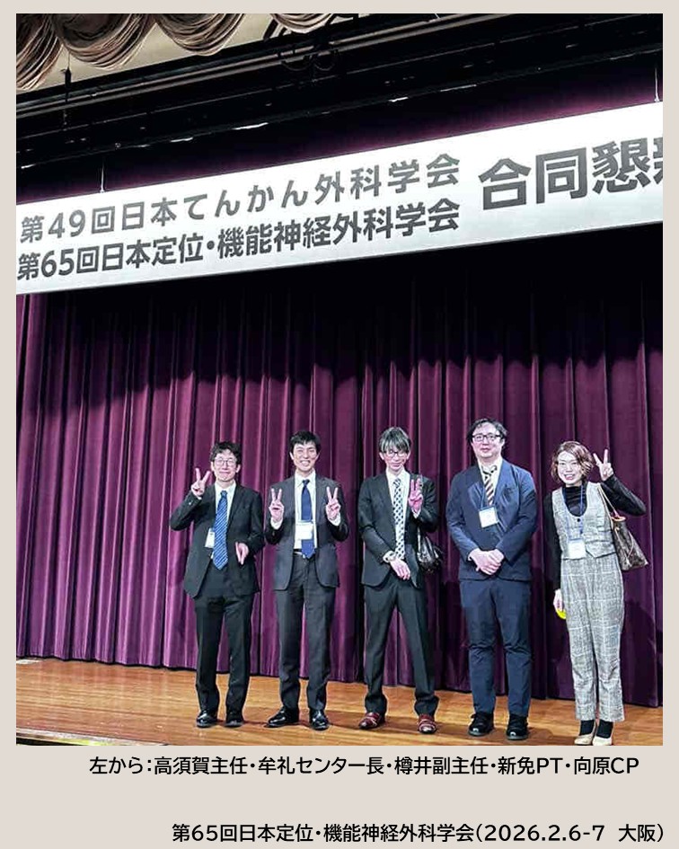 第65回日本定位・機能神経外科学会「守破離 伝統を守り 工夫と発展 そして創造」をテーマに、令和8年2月6日・7日に大阪府大阪市の大阪国際会議場にて開催されました。当院からは牟礼センター長、臨床工学技士2名、理学療法士1名、公認心理師1名が参加し、発表を行いました。
